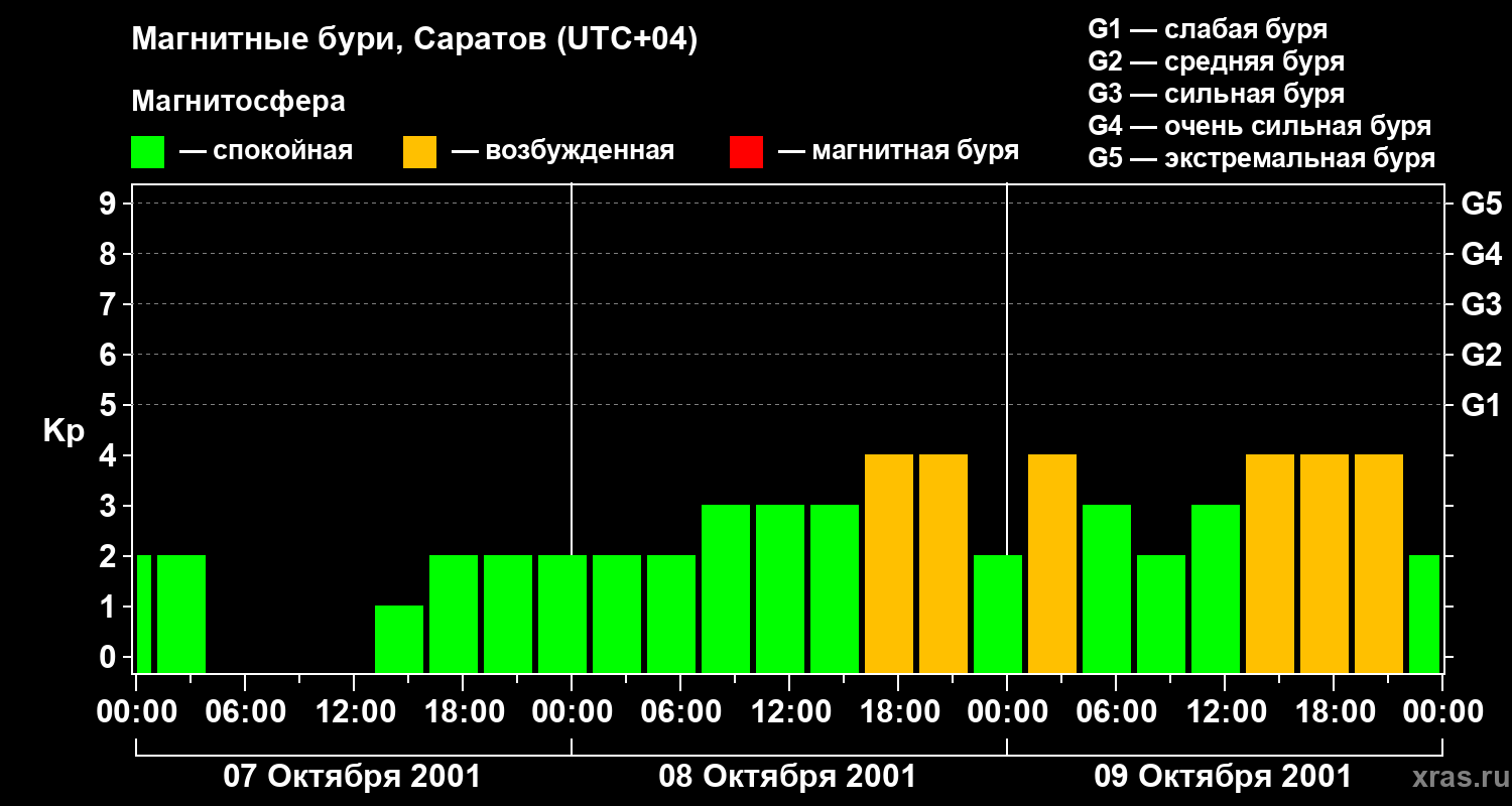 Изменения геомагнитного индекса Kp с 7 по 9 октября 2001 года для средних широт