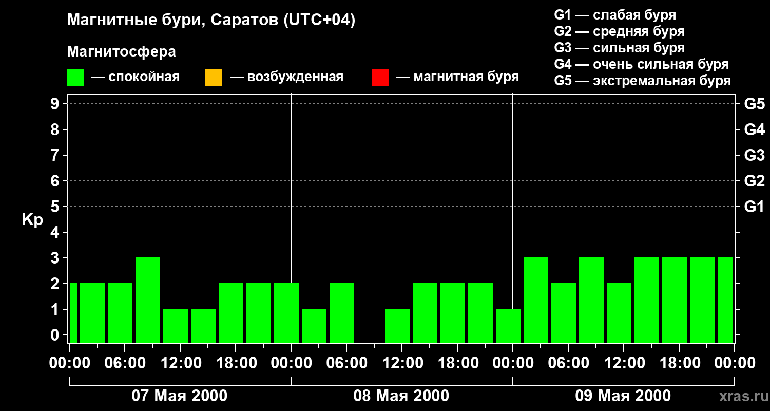 Изменения геомагнитного индекса Kp с 7 по 9 мая 2000 года для средних широт