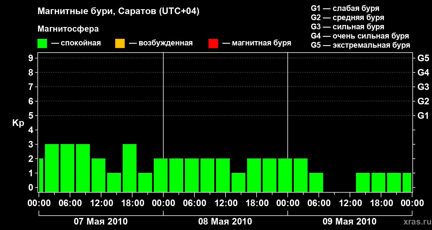 Изменения геомагнитного индекса Kp с 7 по 9 мая 2010 года для средних широт