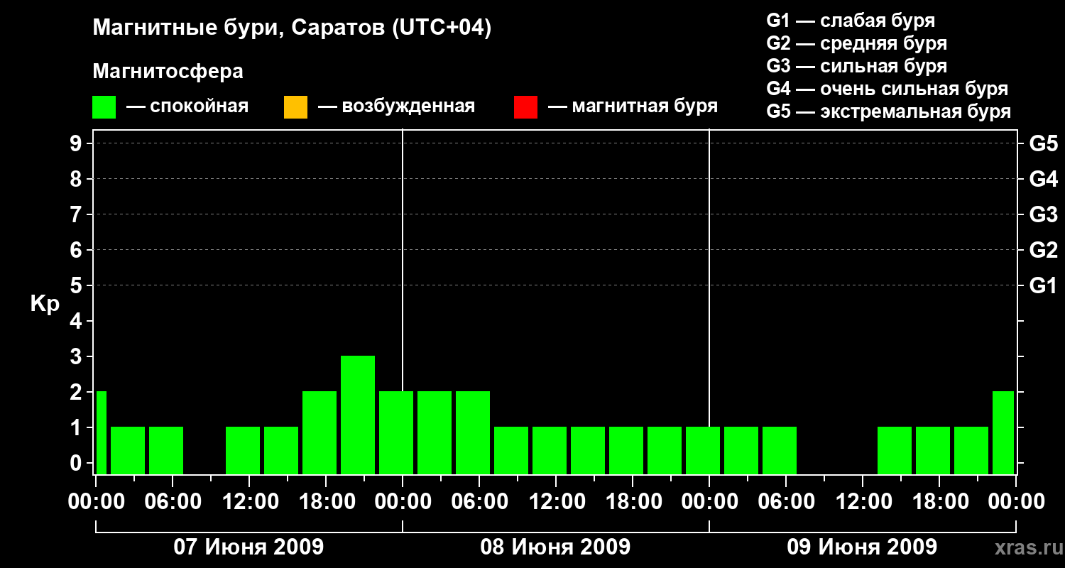 Изменения геомагнитного индекса Kp с 7 по 9 июня 2009 года для средних широт