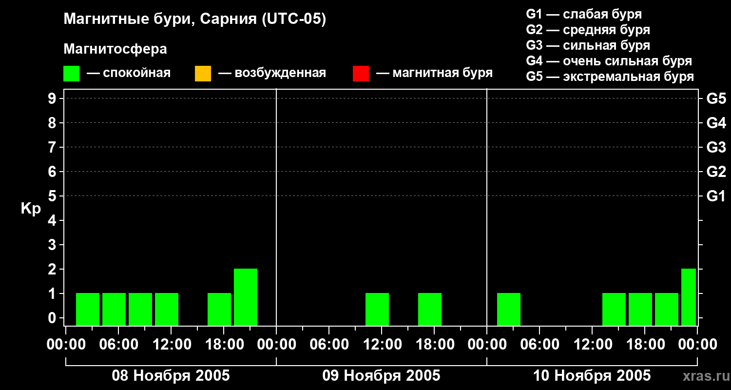 Изменения геомагнитного индекса Kp с 8 по 10 ноября 2005 года для средних широт