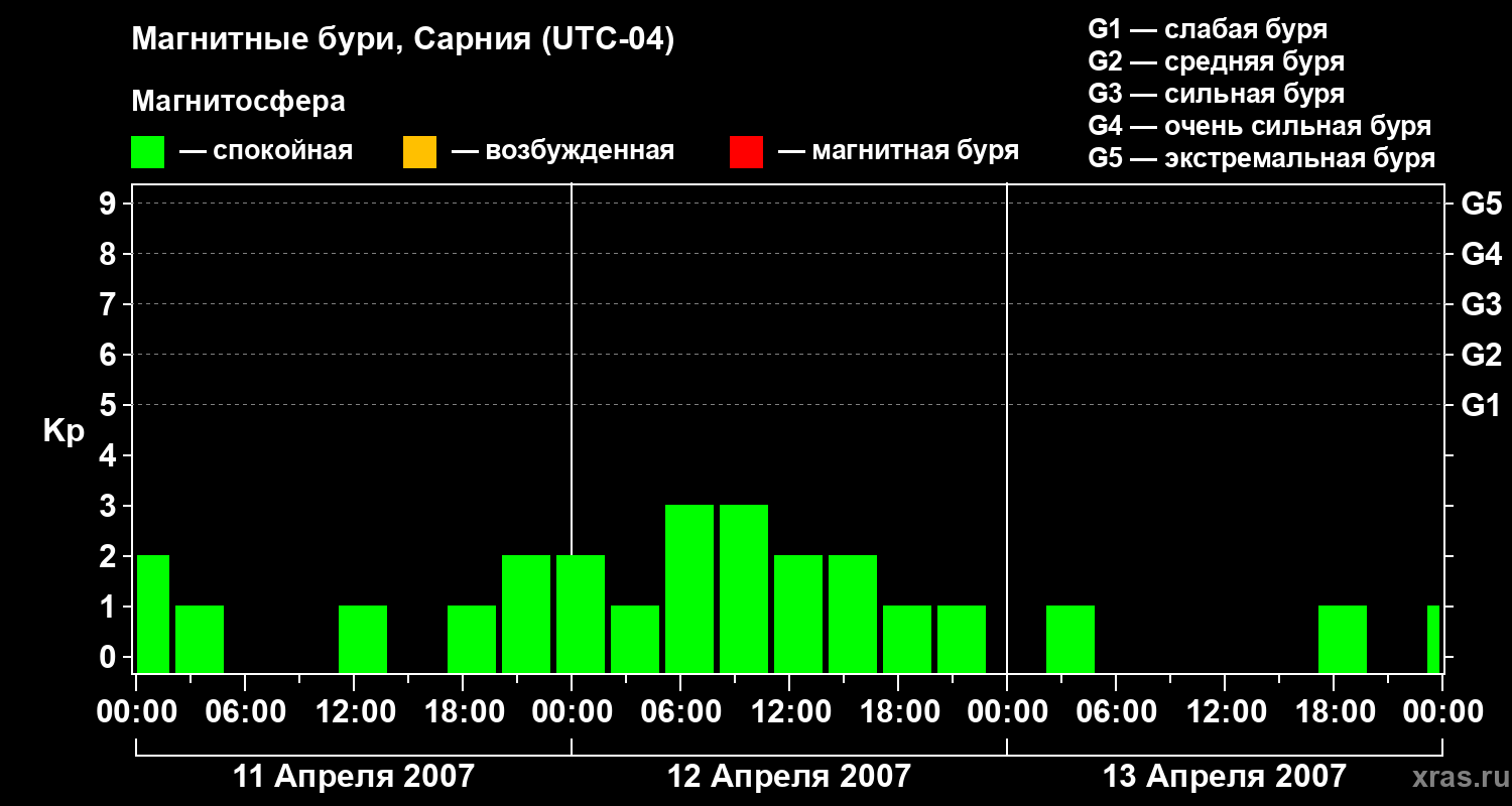 Изменения геомагнитного индекса Kp с 11 по 13 апреля 2007 года для средних широт