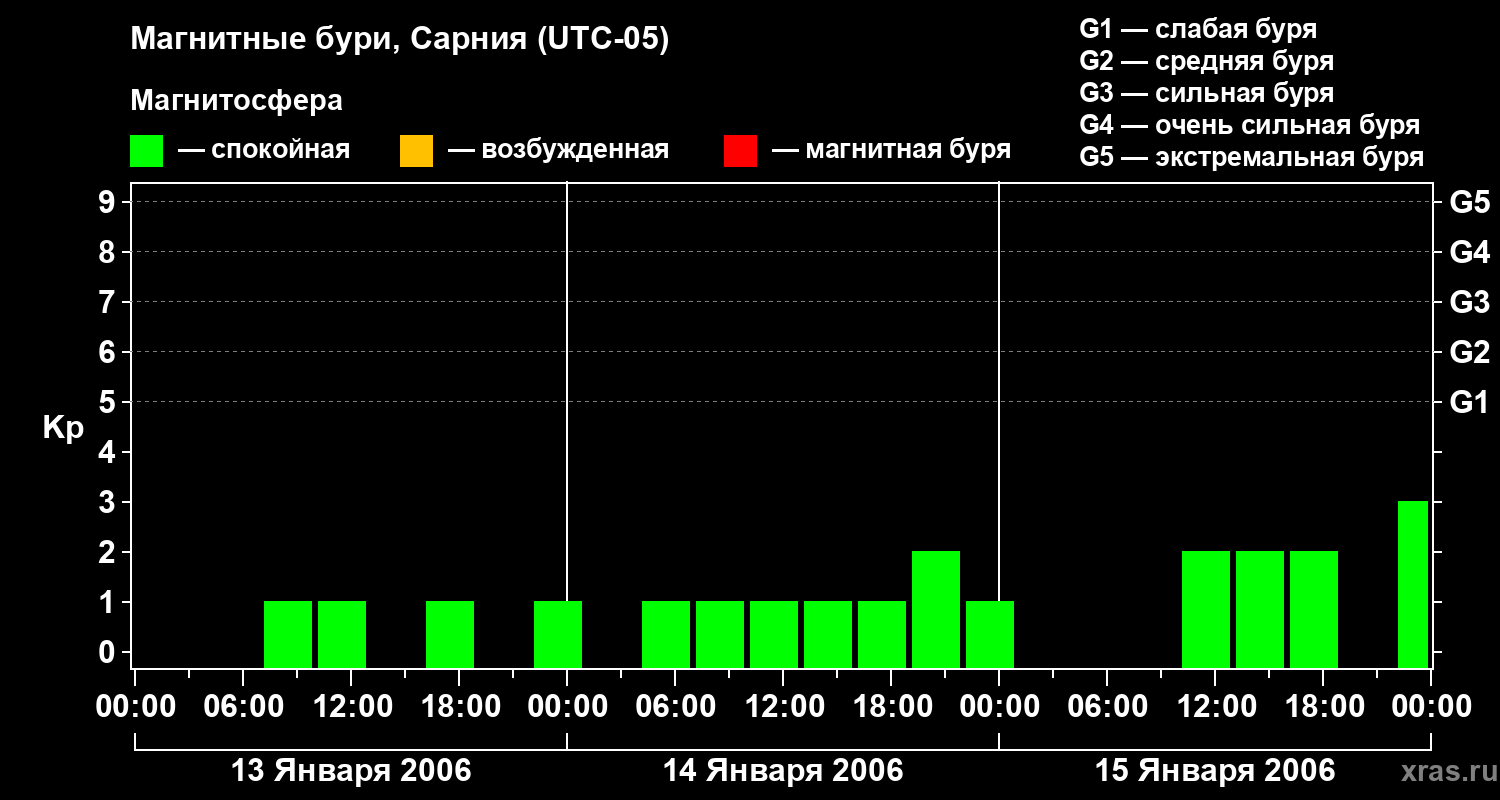 Изменения геомагнитного индекса Kp с 13 по 15 января 2006 года для средних широт