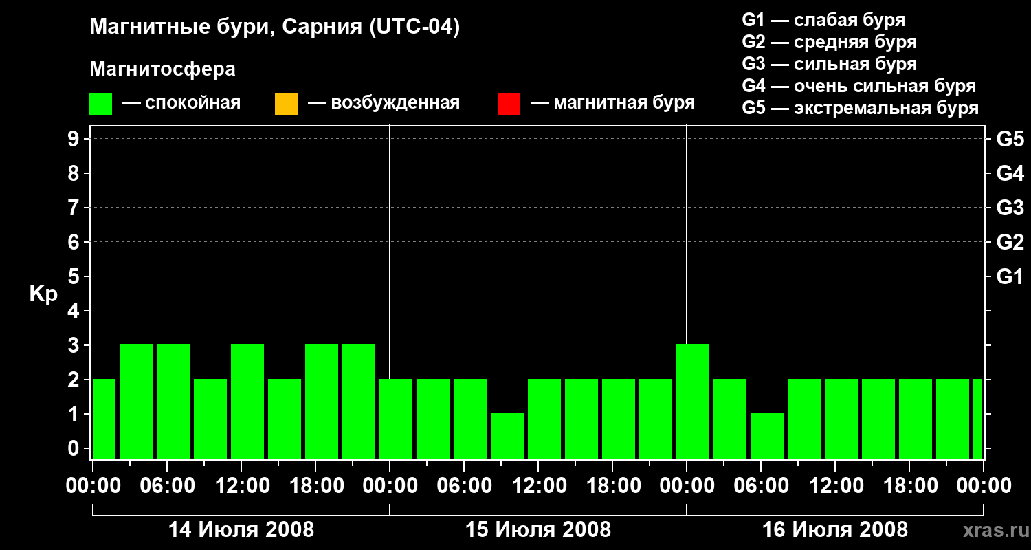 Изменения геомагнитного индекса Kp с 14 по 16 июля 2008 года для средних широт