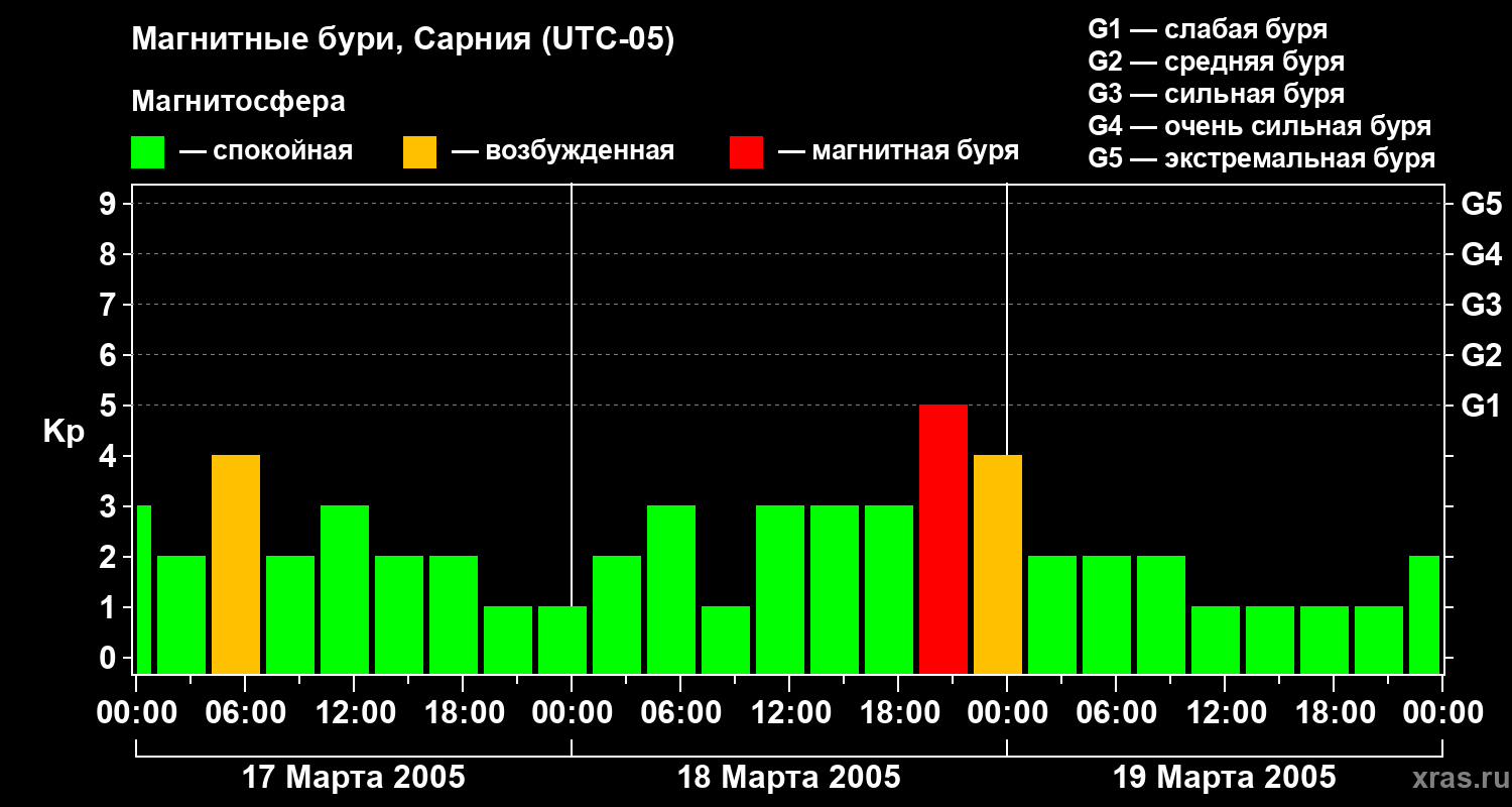 Изменения геомагнитного индекса Kp с 17 по 19 марта 2005 года для средних широт