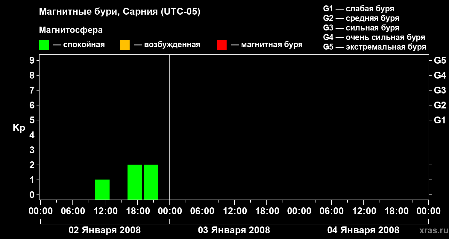Изменения геомагнитного индекса Kp с 2 по 4 января 2008 года для средних широт
