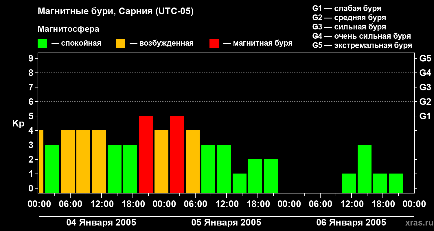 Изменения геомагнитного индекса Kp с 4 по 6 января 2005 года для средних широт