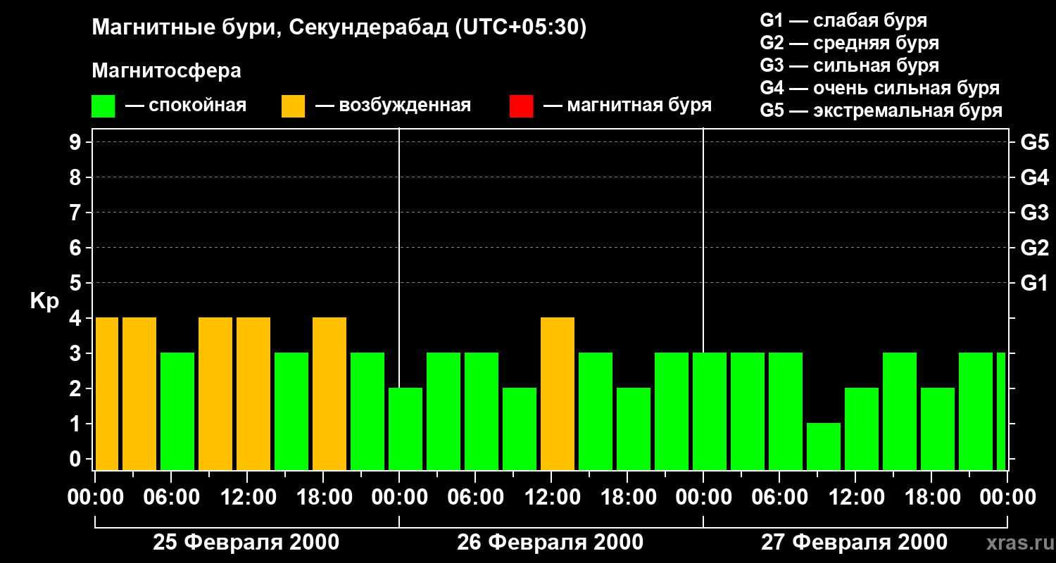 Изменения геомагнитного индекса Kp с 25 по 27 февраля 2000 года для средних широт