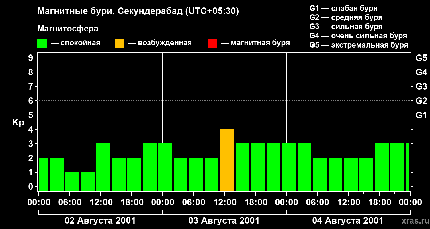 Изменения геомагнитного индекса Kp с 2 по 4 августа 2001 года для средних широт