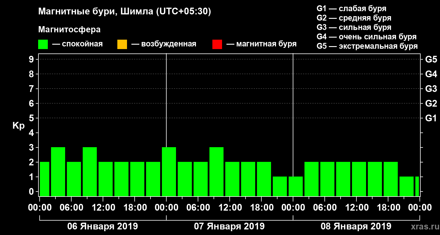 Изменения геомагнитного индекса Kp с 6 по 8 января 2019 года для средних широт