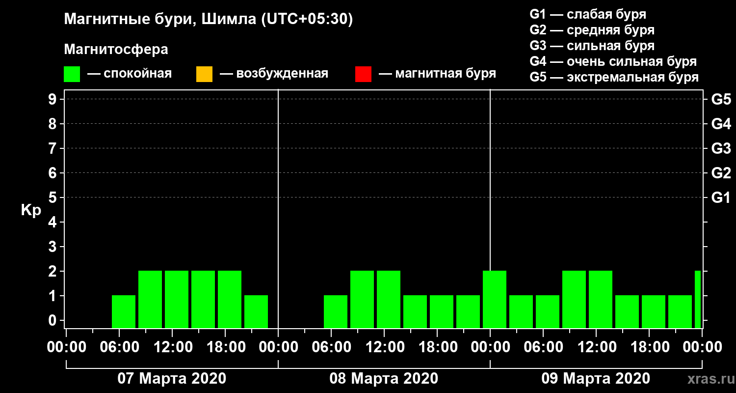 Изменения геомагнитного индекса Kp с 7 по 9 марта 2020 года для средних широт