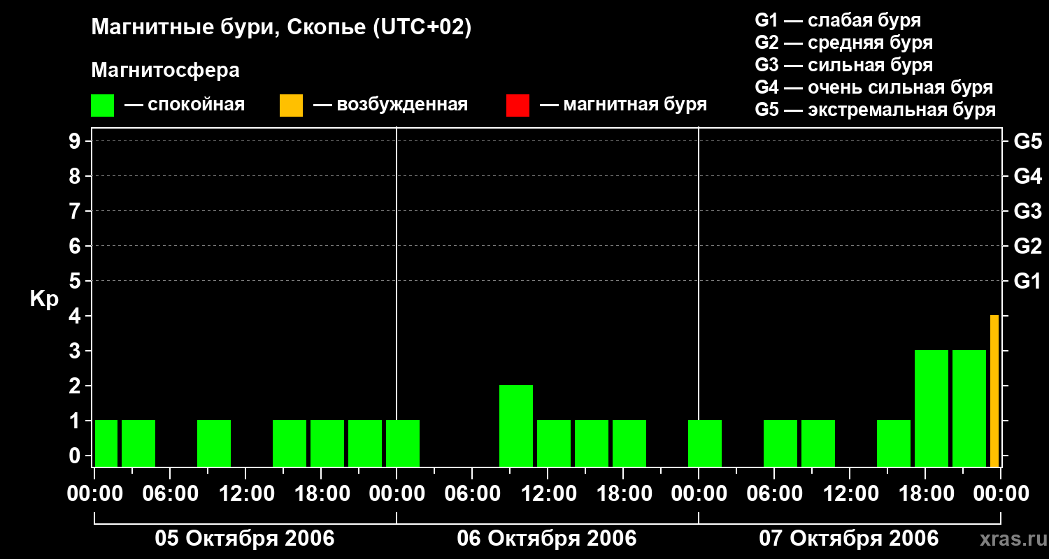 Изменения геомагнитного индекса Kp с 5 по 7 октября 2006 года для средних широт