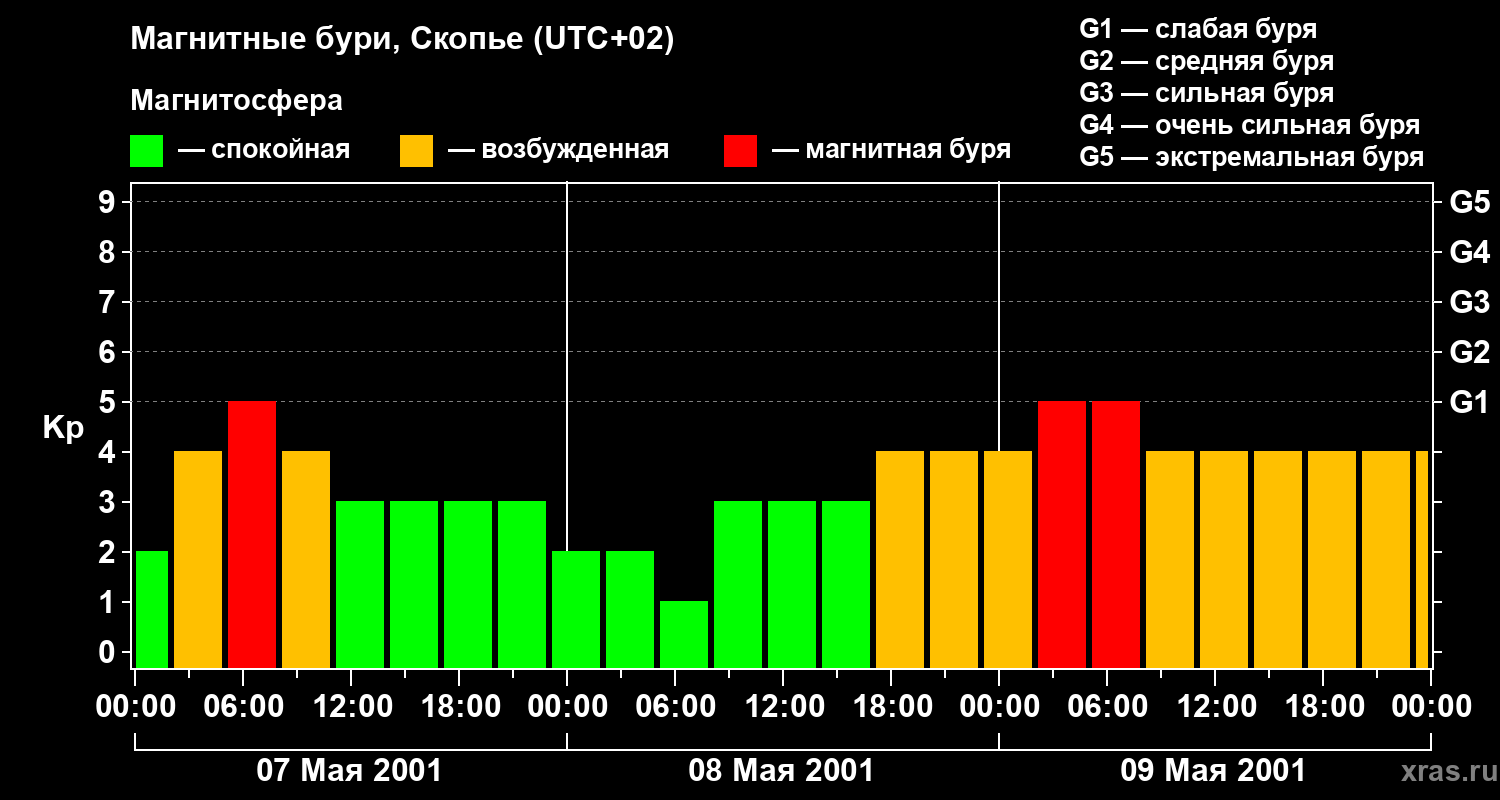 Изменения геомагнитного индекса Kp с 7 по 9 мая 2001 года для средних широт