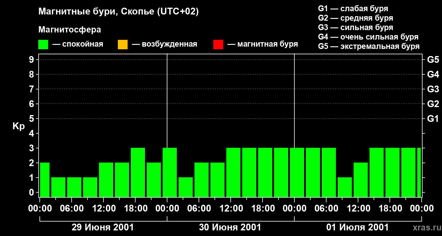 Изменения геомагнитного индекса Kp с 29 июня по 1 июля 2001 года для средних широт