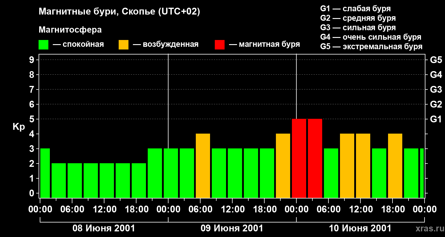Изменения геомагнитного индекса Kp с 8 по 10 июня 2001 года для средних широт