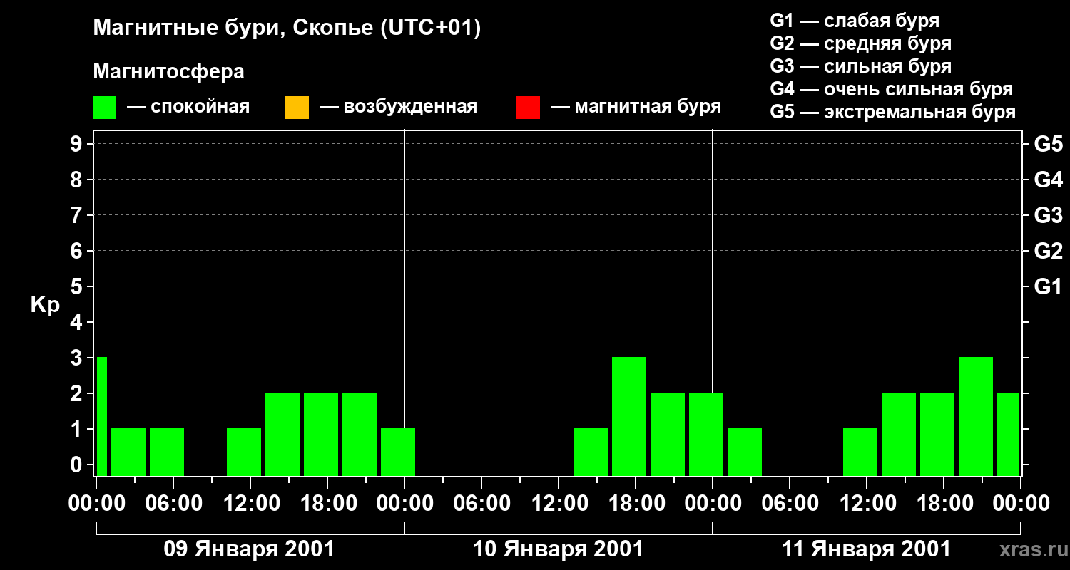 Изменения геомагнитного индекса Kp с 9 по 11 января 2001 года для средних широт