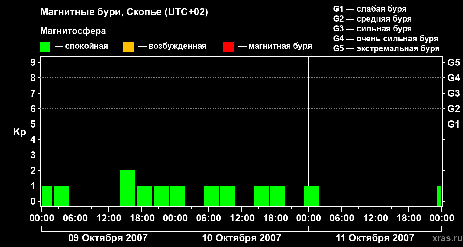 Изменения геомагнитного индекса Kp с 9 по 11 октября 2007 года для средних широт