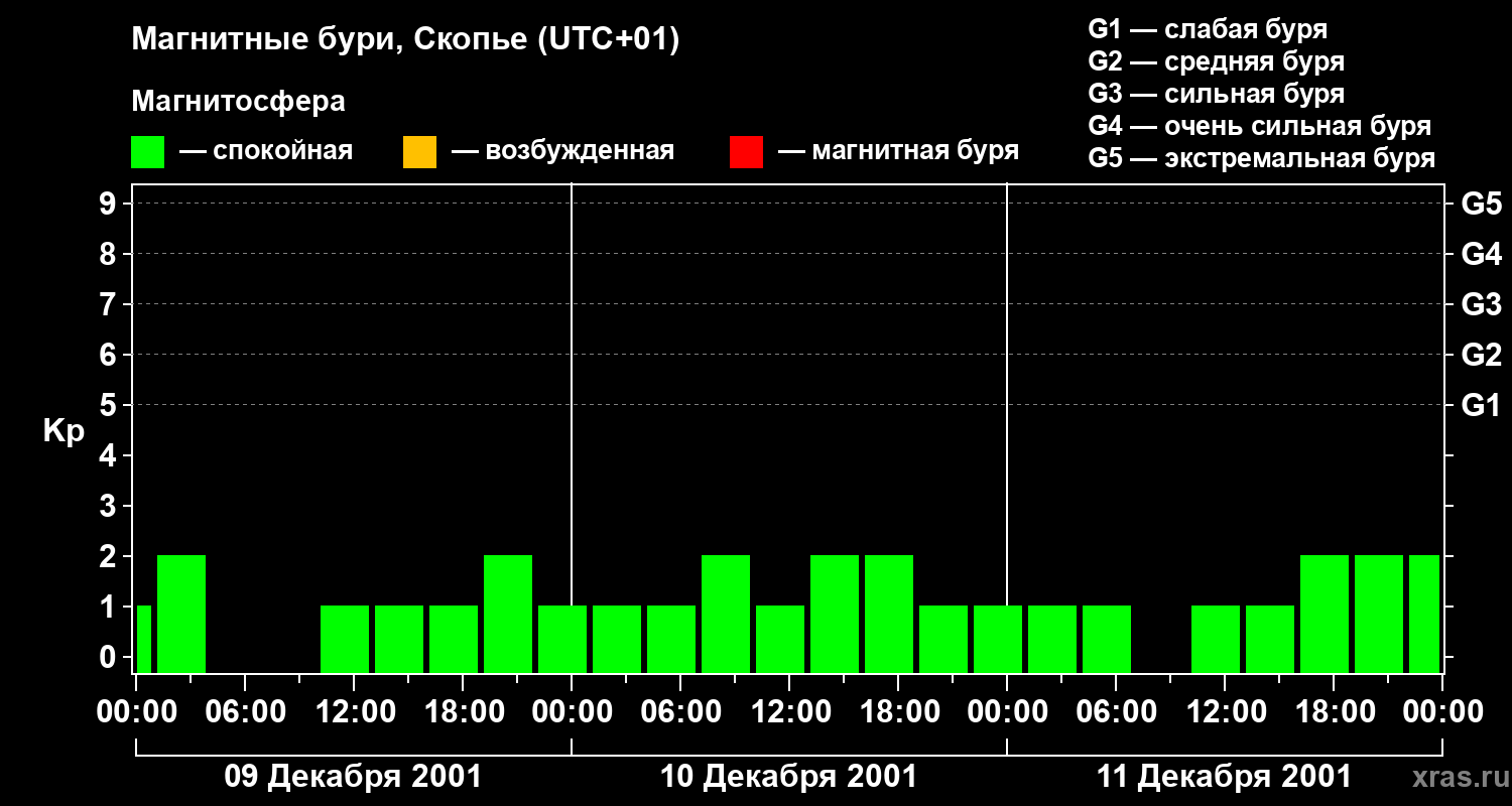 Изменения геомагнитного индекса Kp с 9 по 11 декабря 2001 года для средних широт