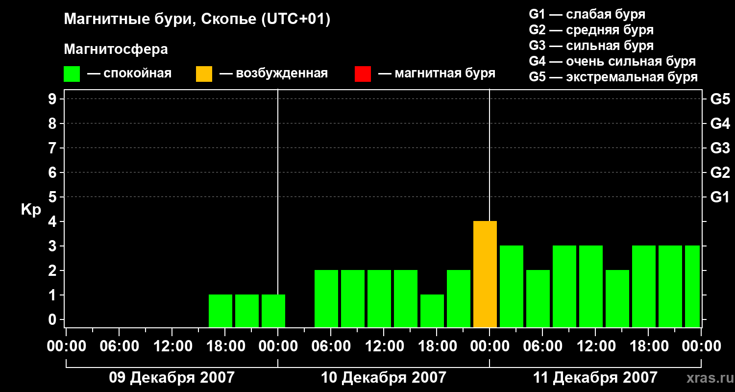 Изменения геомагнитного индекса Kp с 9 по 11 декабря 2007 года для средних широт