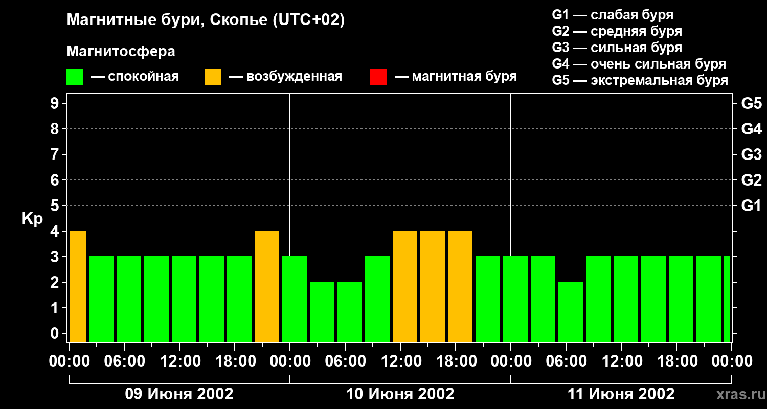 Изменения геомагнитного индекса Kp с 9 по 11 июня 2002 года для средних широт
