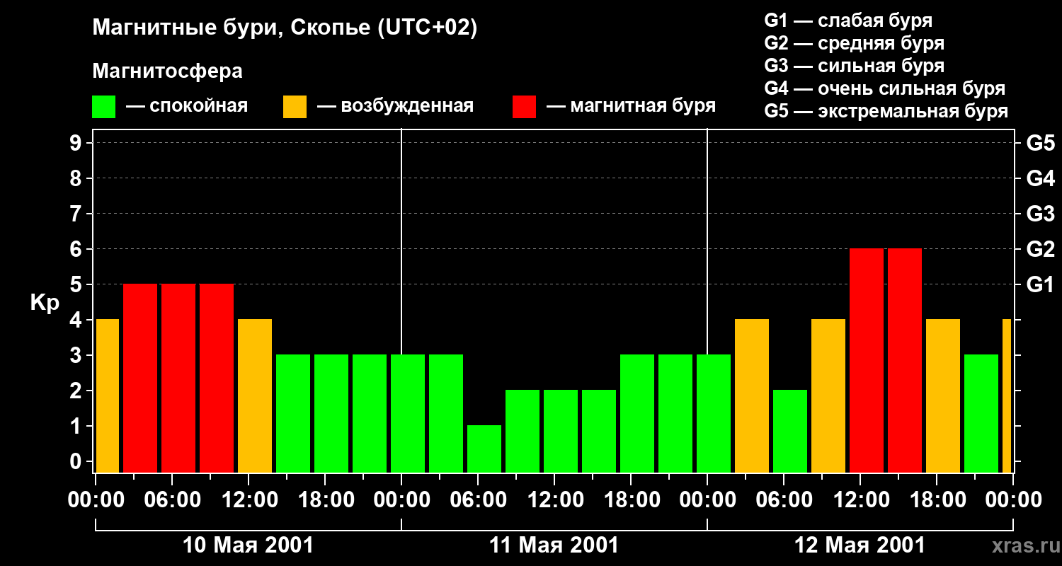 Изменения геомагнитного индекса Kp с 10 по 12 мая 2001 года для средних широт