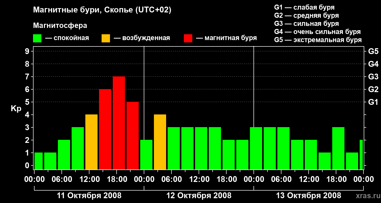 Изменения геомагнитного индекса Kp с 11 по 13 октября 2008 года для средних широт