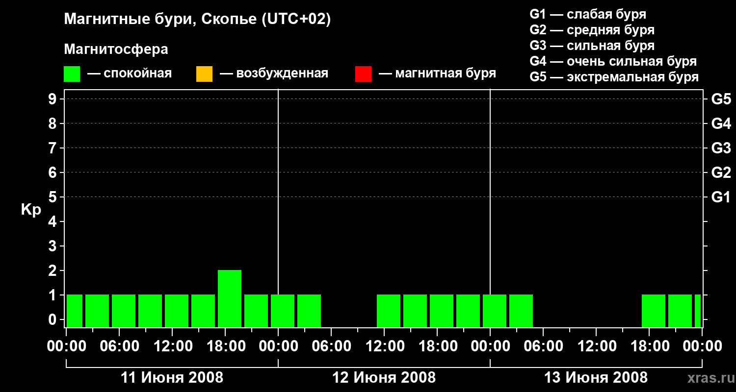Изменения геомагнитного индекса Kp с 11 по 13 июня 2008 года для средних широт