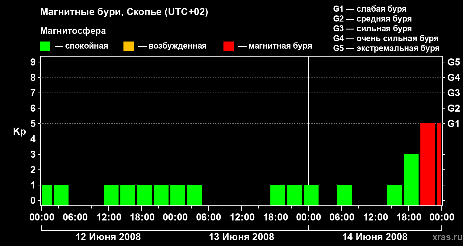 Изменения геомагнитного индекса Kp с 12 по 14 июня 2008 года для средних широт
