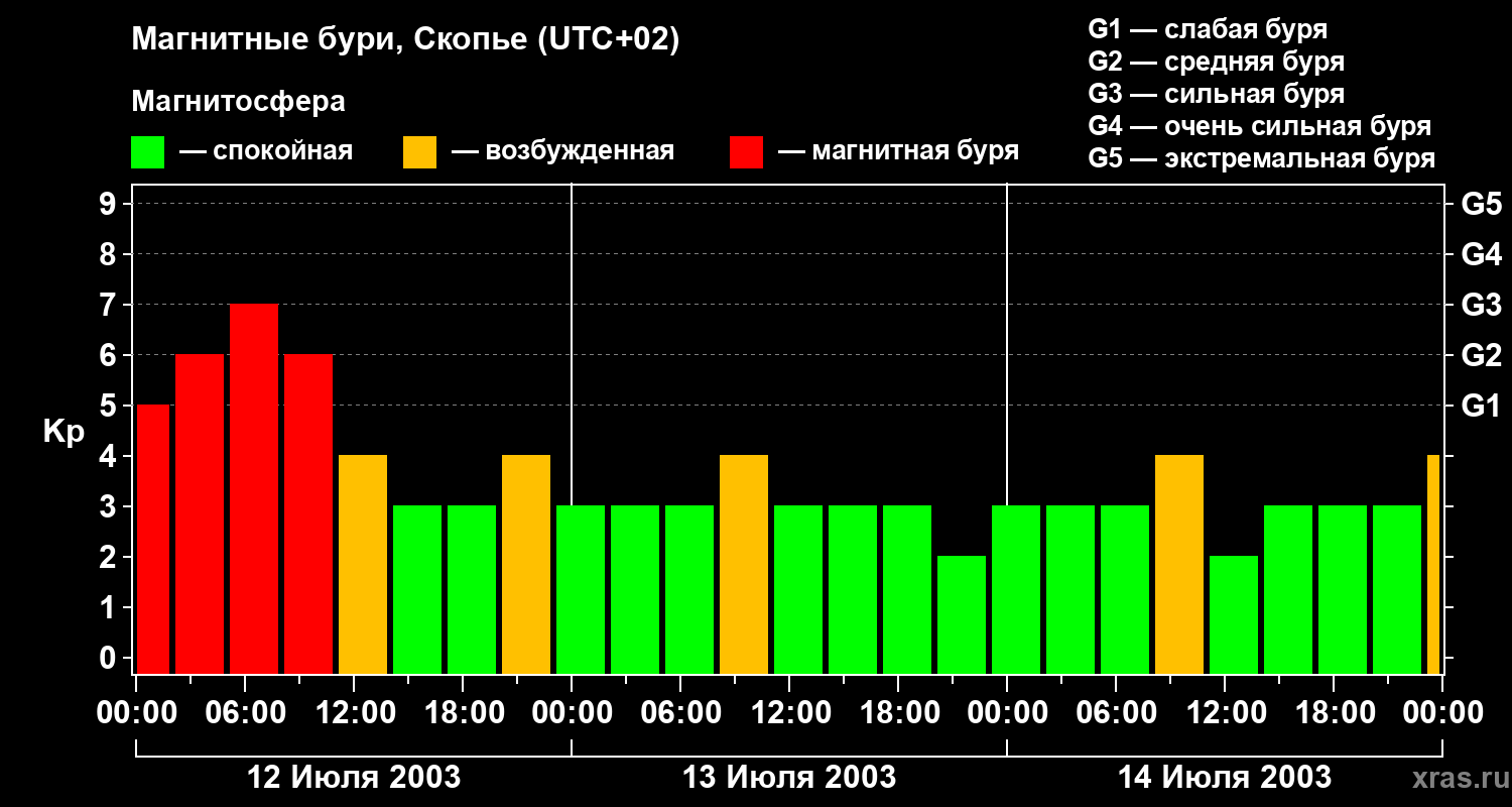 Изменения геомагнитного индекса Kp с 12 по 14 июля 2003 года для средних широт