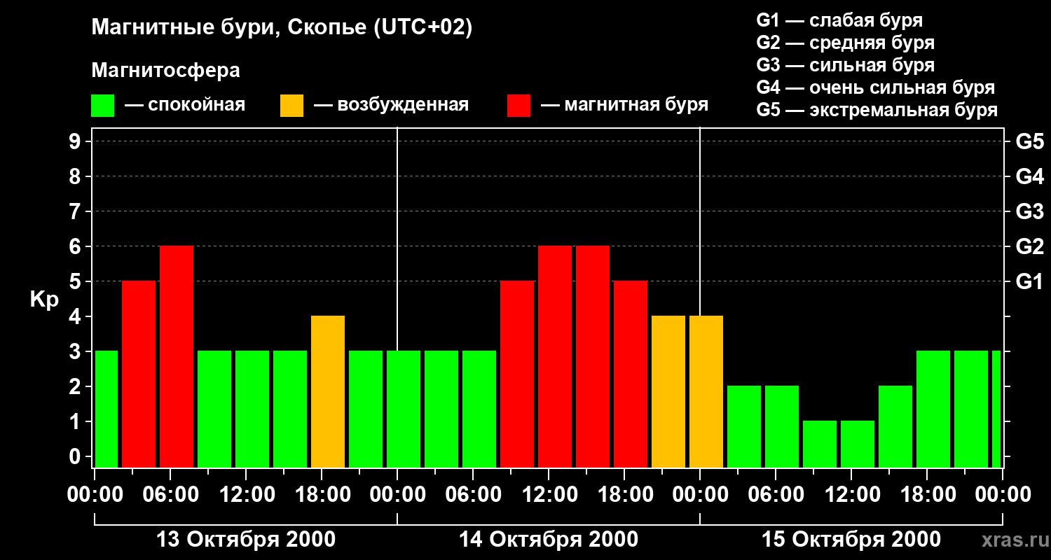 Изменения геомагнитного индекса Kp с 13 по 15 октября 2000 года для средних широт