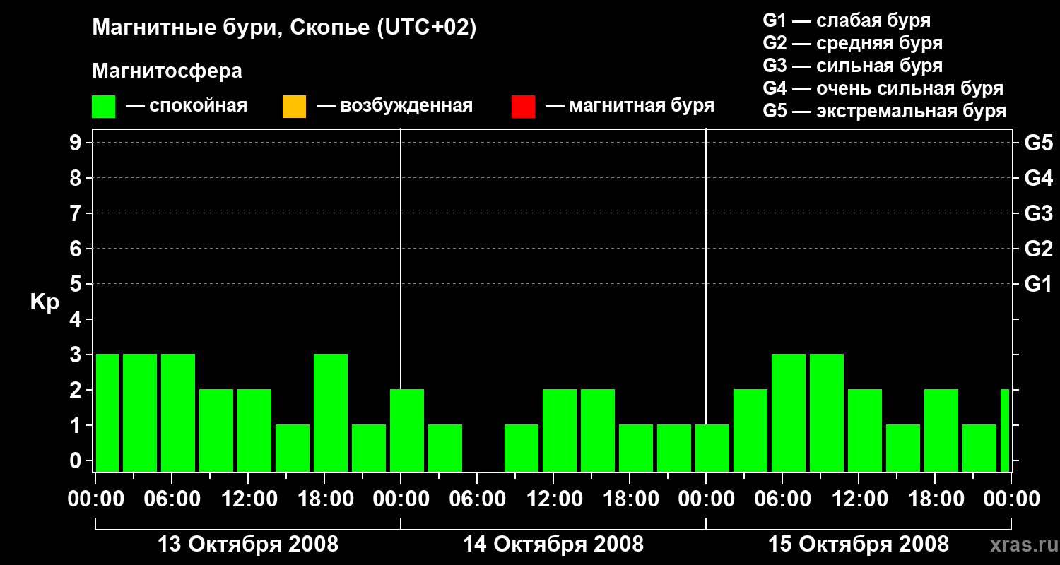 Изменения геомагнитного индекса Kp с 13 по 15 октября 2008 года для средних широт