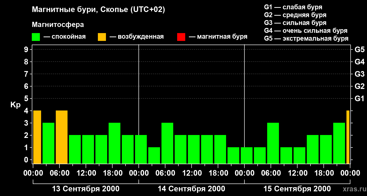 Изменения геомагнитного индекса Kp с 13 по 15 сентября 2000 года для средних широт