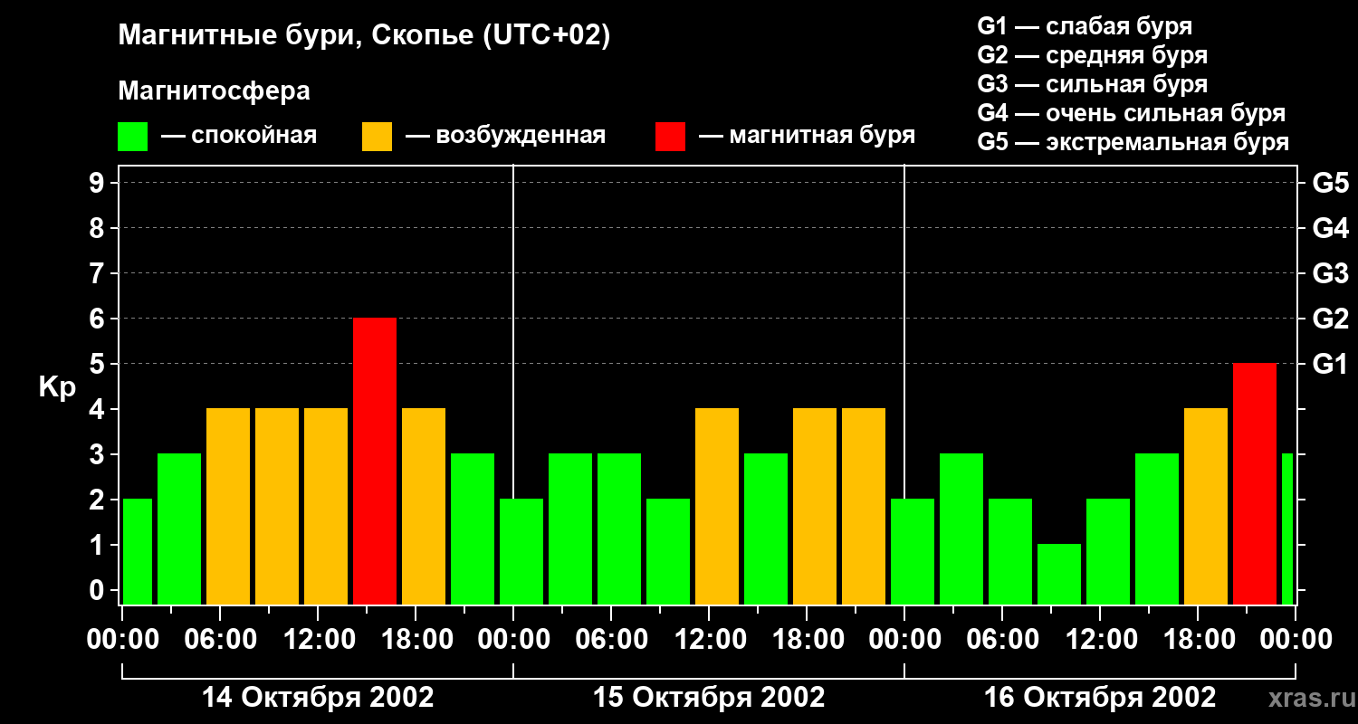 Изменения геомагнитного индекса Kp с 14 по 16 октября 2002 года для средних широт