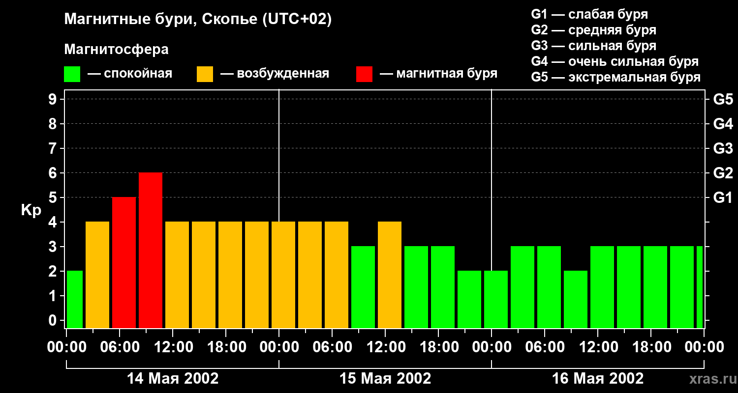 Изменения геомагнитного индекса Kp с 14 по 16 мая 2002 года для средних широт