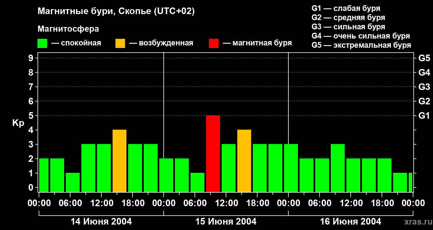 Изменения геомагнитного индекса Kp с 14 по 16 июня 2004 года для средних широт