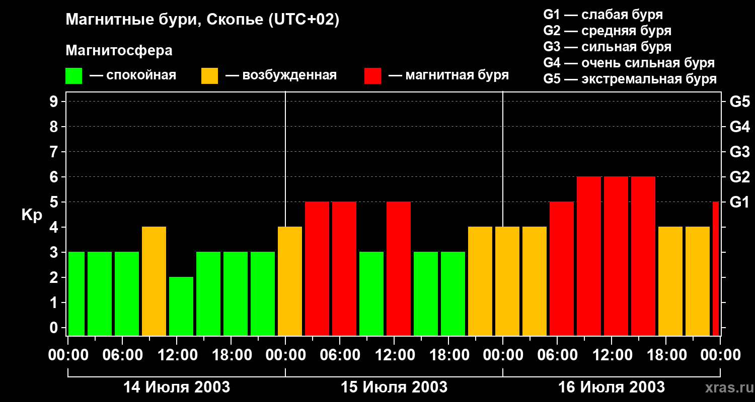 Изменения геомагнитного индекса Kp с 14 по 16 июля 2003 года для средних широт