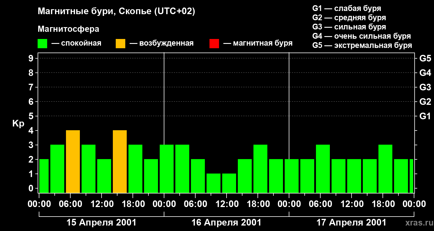 Изменения геомагнитного индекса Kp с 15 по 17 апреля 2001 года для средних широт