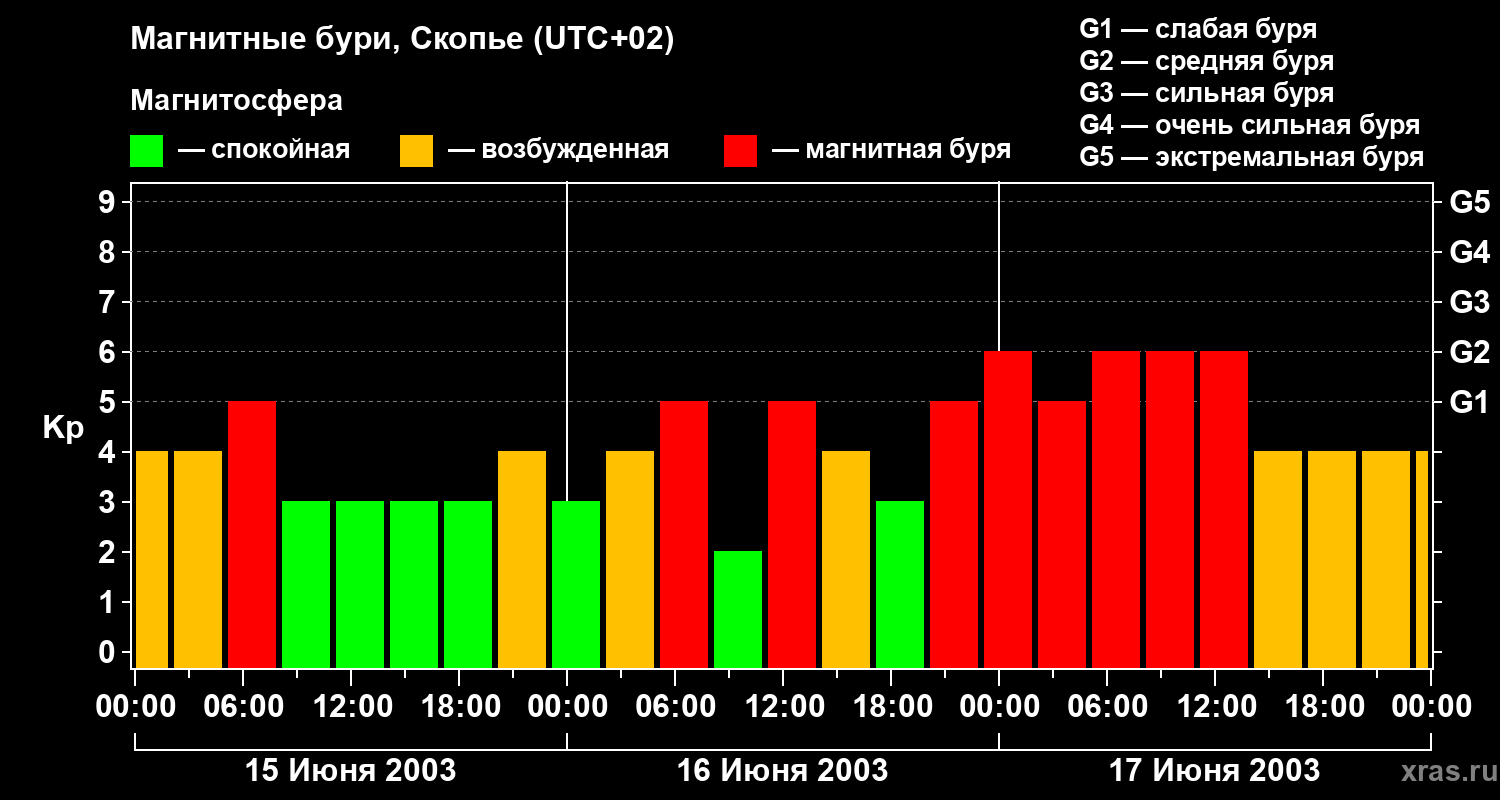Изменения геомагнитного индекса Kp с 15 по 17 июня 2003 года для средних широт