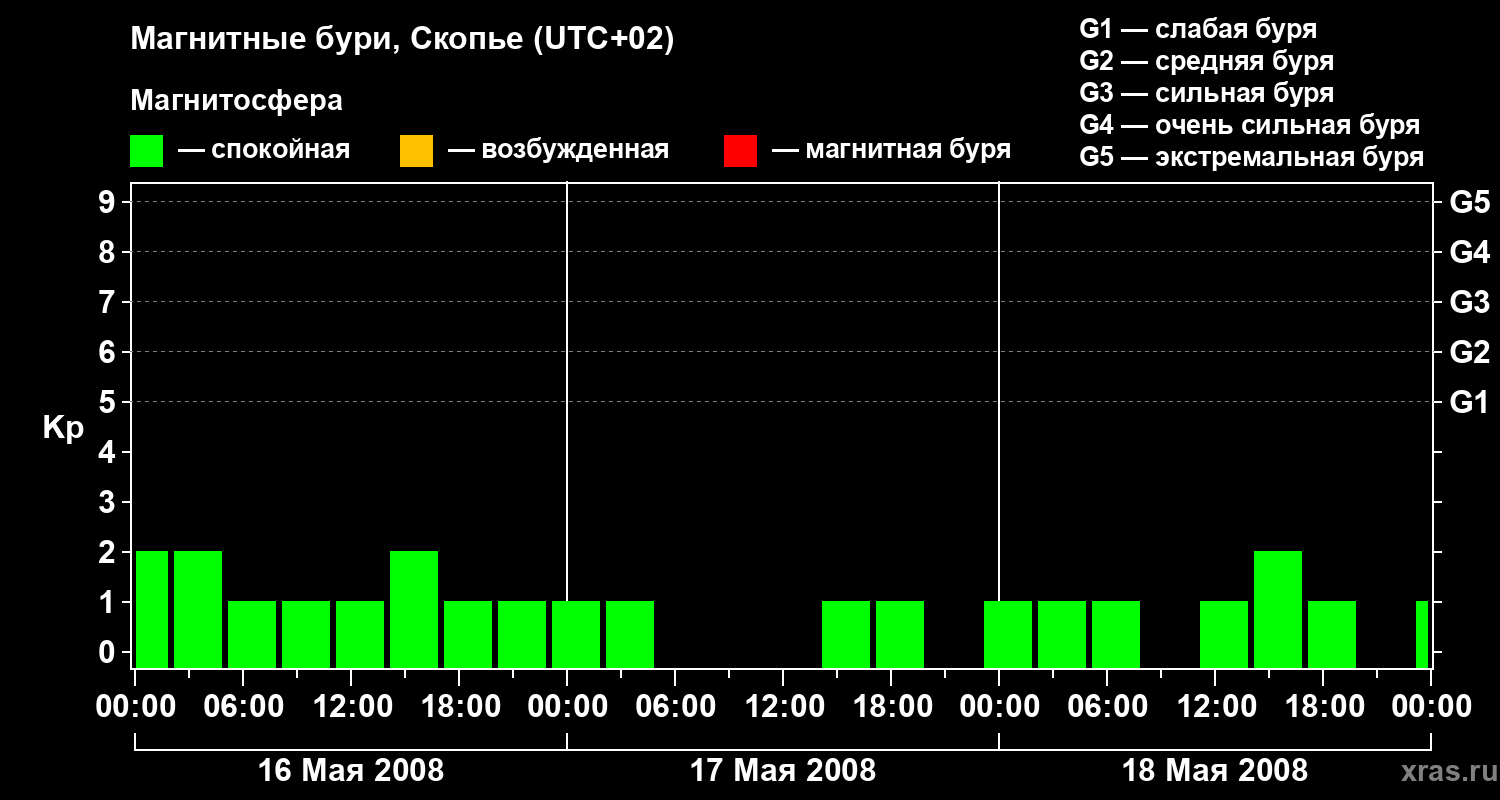 Изменения геомагнитного индекса Kp с 16 по 18 мая 2008 года для средних широт