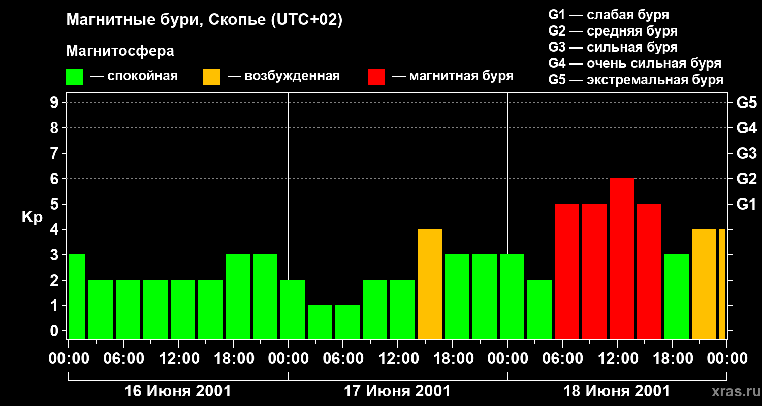 Изменения геомагнитного индекса Kp с 16 по 18 июня 2001 года для средних широт