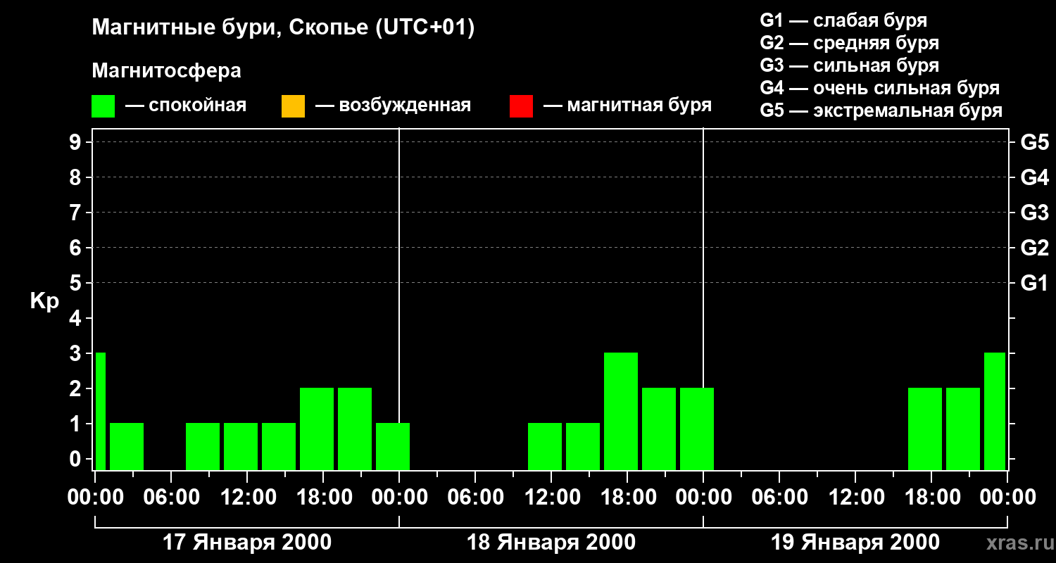 Изменения геомагнитного индекса Kp с 17 по 19 января 2000 года для средних широт