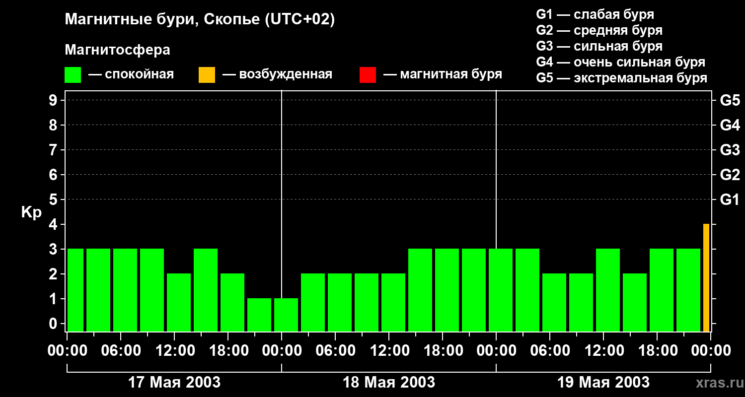 Изменения геомагнитного индекса Kp с 17 по 19 мая 2003 года для средних широт
