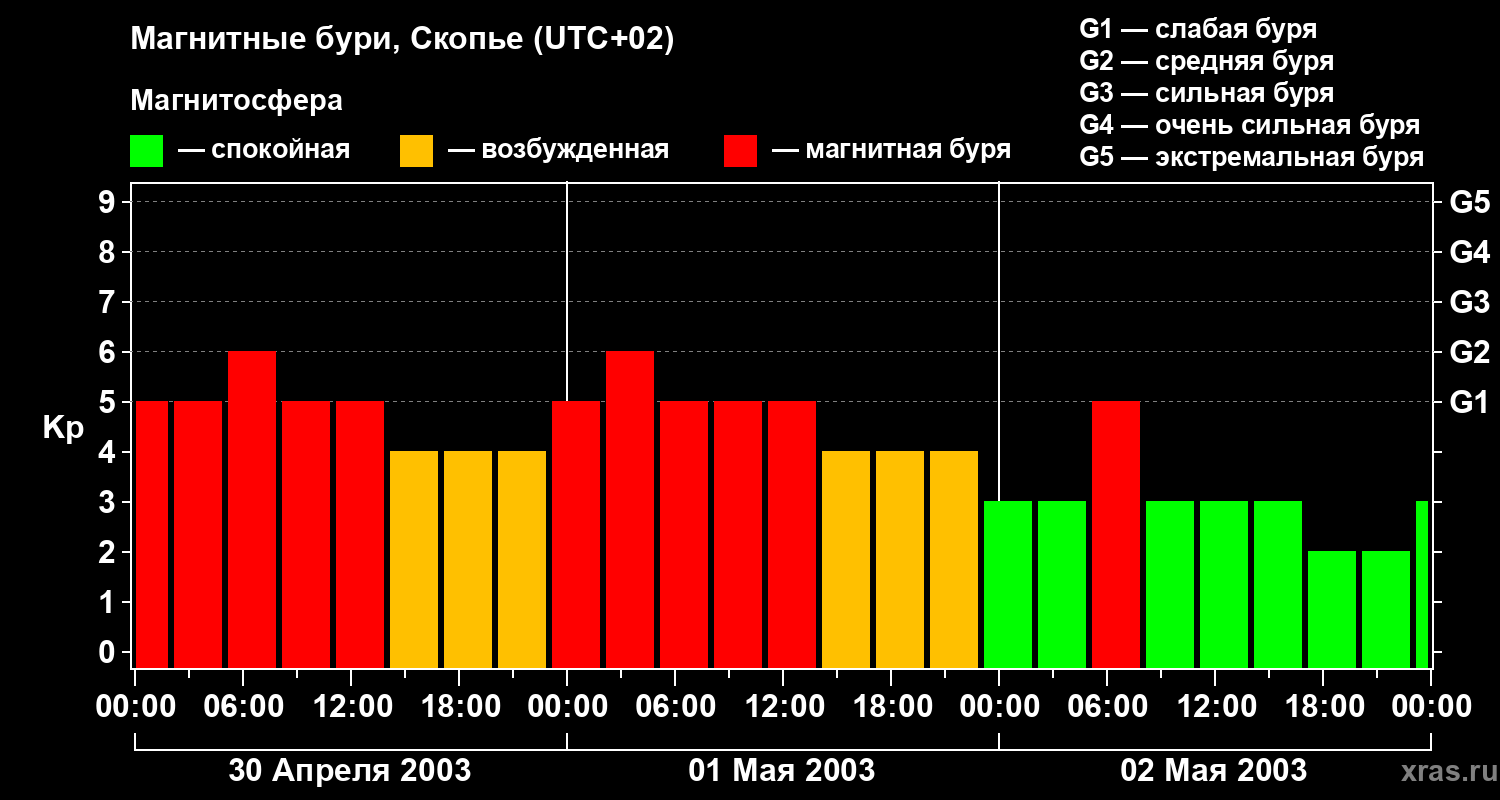 Изменения геомагнитного индекса Kp с 30 апреля по 2 мая 2003 года для средних широт