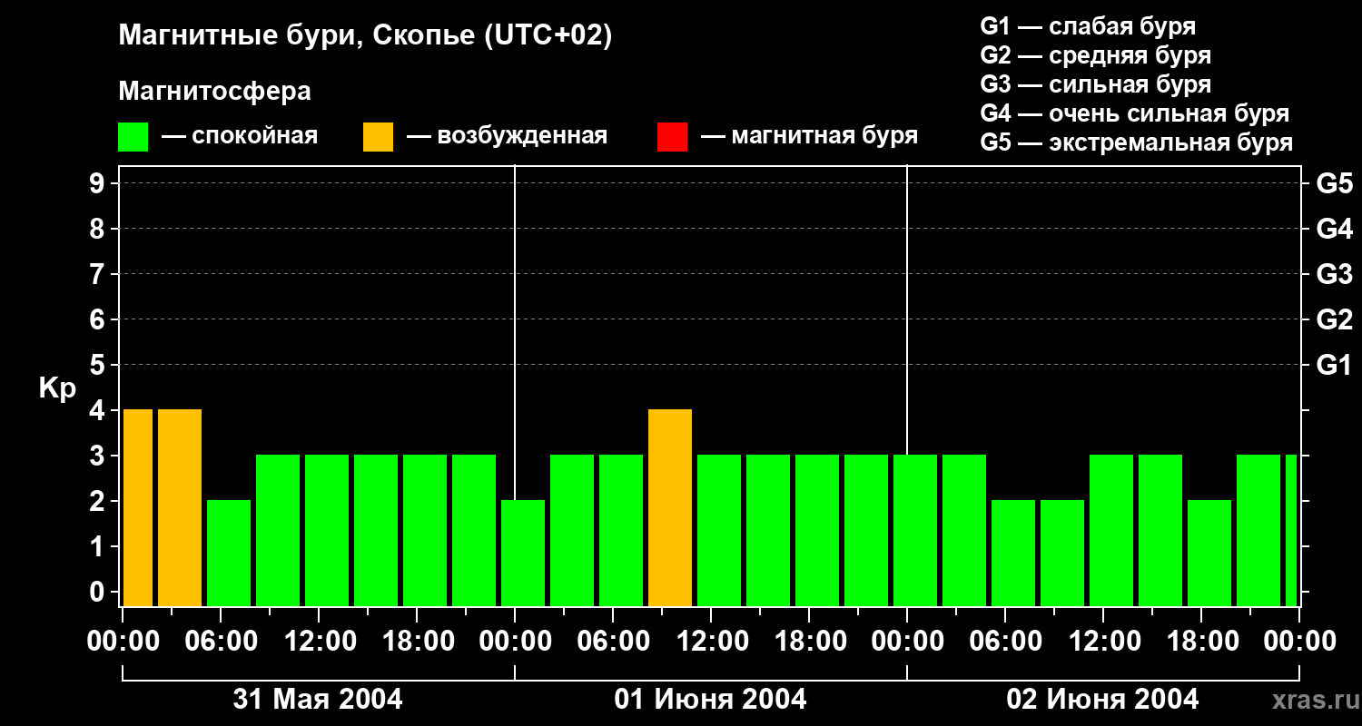 Изменения геомагнитного индекса Kp с 31 мая по 2 июня 2004 года для средних широт