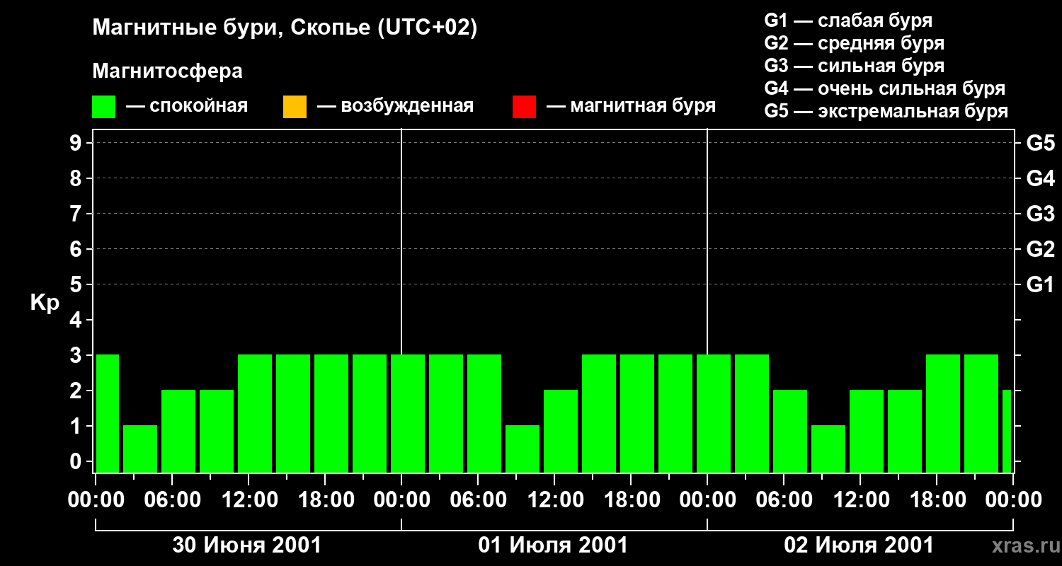 Изменения геомагнитного индекса Kp с 30 июня по 2 июля 2001 года для средних широт