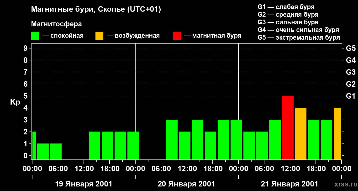 Изменения геомагнитного индекса Kp с 19 по 21 января 2001 года для средних широт