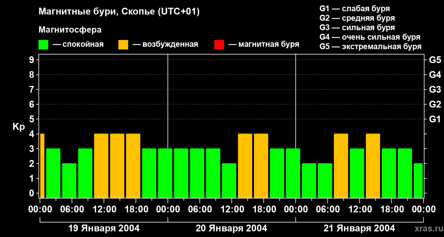 Изменения геомагнитного индекса Kp с 19 по 21 января 2004 года для средних широт