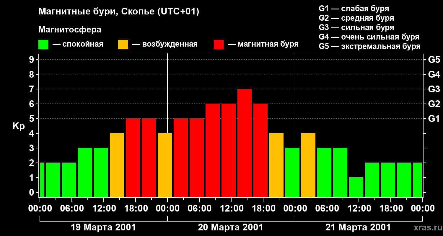 Изменения геомагнитного индекса Kp с 19 по 21 марта 2001 года для средних широт