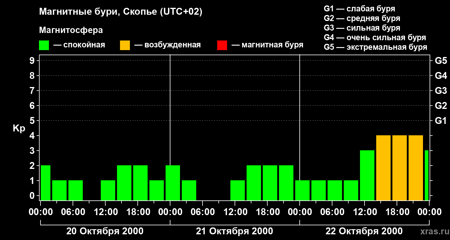 Изменения геомагнитного индекса Kp с 20 по 22 октября 2000 года для средних широт