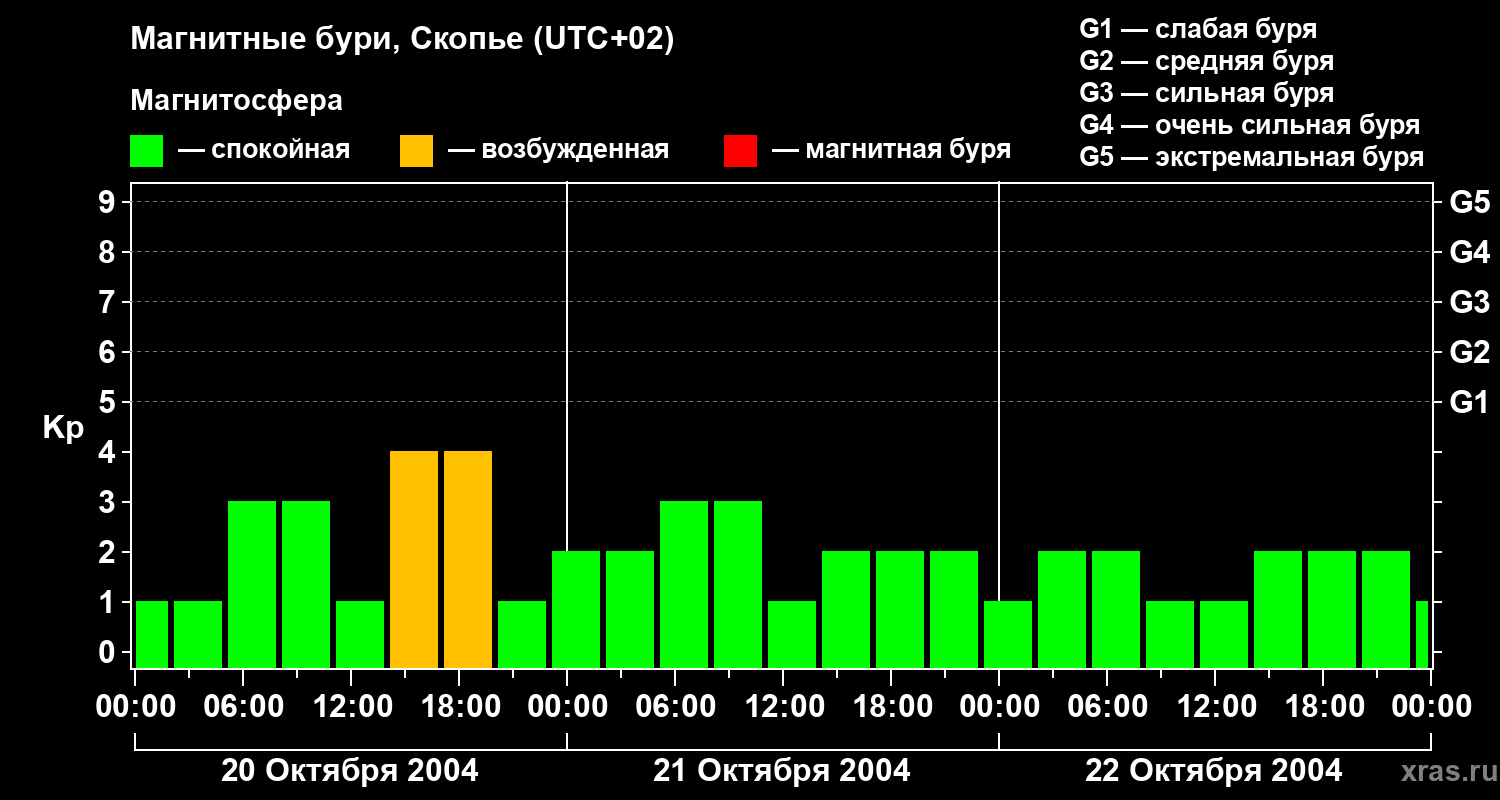 Изменения геомагнитного индекса Kp с 20 по 22 октября 2004 года для средних широт